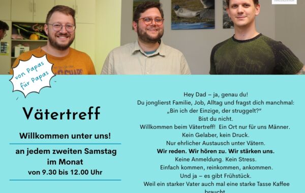 Am 10.01.2026 findet von 9.30 bis 12.00 Uhr unser Vätertreff statt. Von Papas für Papas! Packt eure Kinder ein und kommt auf einen Kaffee und einen Ratsch bei uns vorbei.