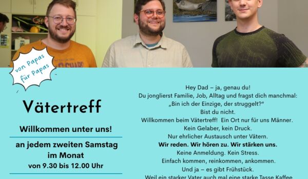 Am 10.01.2026 findet von 9.30 bis 12.00 Uhr unser Vätertreff statt. Von Papas für Papas! Packt eure Kinder ein und kommt auf einen Kaffee und einen Ratsch bei uns vorbei.